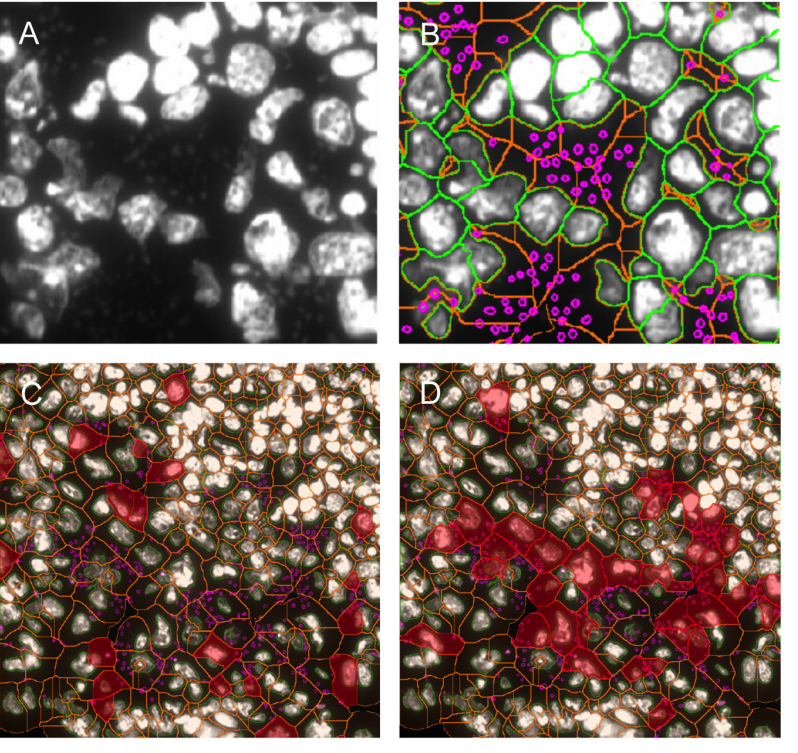 单通道影像获取,利用四通道进行荧光检(DAPI,FITC,Rhodamin,Cy5),每个影像包含将近50-200个细胞,并且扫描部分图像自动拼接。每个荧光通道的影像和多个FOV都能够被自动获取,收集和后期的组合。(A) 利用参数调节识别细胞核(B) 创建ring mask (C) ring mask中黄色高亮部分为自动筛选ROI中病原体