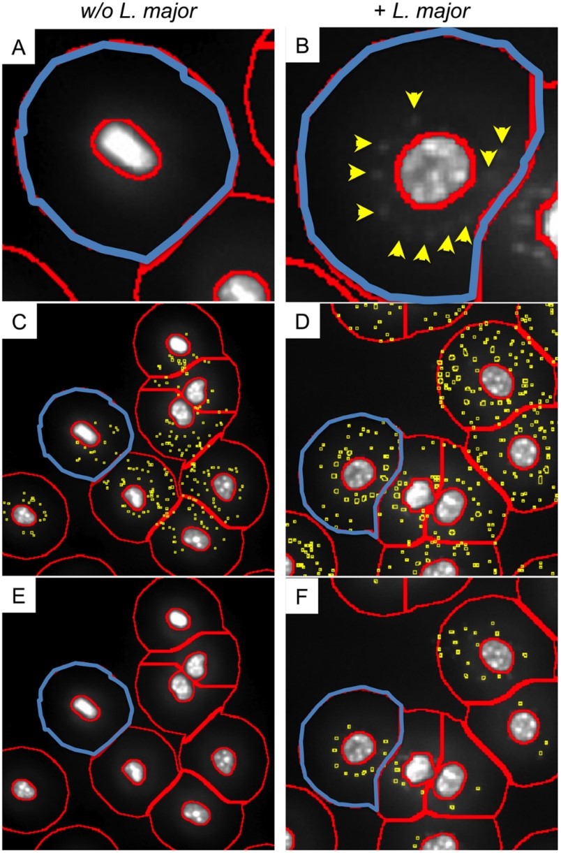 (A) ring mask胞质部分,代表缺少病原体培养的条件下的巨噬细胞。(B) 蓝色部分为感染的巨噬细胞的ring mask,黄色箭头标出DAPI的阳性信号。(C) 黄色部分微弱信号区分未感染的巨噬细胞的ring mask中的伪信号。(D)创建伪阳性信号。多于30个病原体的巨噬细胞被标出。(E)检测微弱信号区分没有被感染的巨噬细胞的ring mask中的非伪信号。(F)所有被感染的巨噬细胞(黄色部分和黄色箭头)均被识别出。