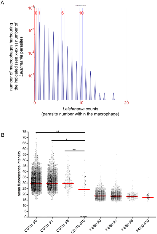 (A) 直方图表示X轴巨噬细胞拥有病原体与Y轴病原体的数量。分析得到细胞核,ring mask,ring mask中的病原体,ring mask中的CD11b或者F4/80的强度表达(B) 拥有不同数量病原体的巨噬细胞的平均强度分析。估算每个成核原位宿主细胞。