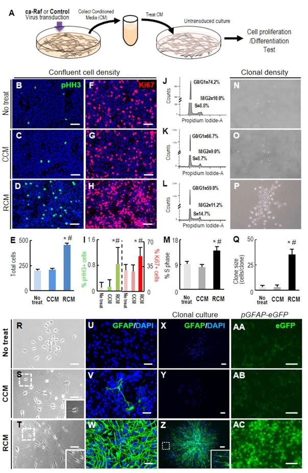 Figure3:用ca-Raf分泌因子转导的皮质NSCs促进细胞增殖和星形胶质细胞标记物表达