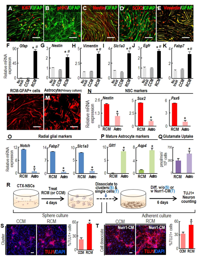 Figure4:将Raf-CM处理后的GFAP阳性细胞数量以及径向神经胶质或成熟的NSC样形态学特征进行分析表明,RCM诱导的GFAP +星形胶质细胞类似于NSC而不是成熟的星形胶质细胞。