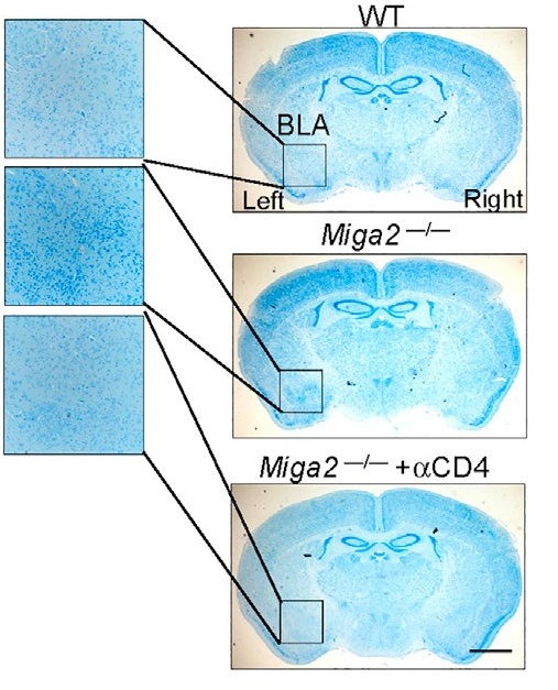 利用StrataQuest软件对脑组织特定脑区尼氏染色神经元进行精准识别,并对其区域形态/密度进行定量分析发现,在Miga2TKO小鼠中杏仁核区显著增大,以及神经元数量增多。