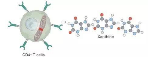 在慢性应激状态下,小鼠体内白三烯b4(LTB4)含量上升,使包括NaiveT细胞在内的非炎性CD4+ T细胞线粒体分裂。代谢组学和转录组分析表明,CD4+ T细胞中线粒体分裂可导致转录因子IRF1累积,IRF1与Ada、Xdh和Pnp2启动子区结合促使葡萄糖更多的通过戊糖磷酸途径代谢,进而从头合成黄嘌呤。
