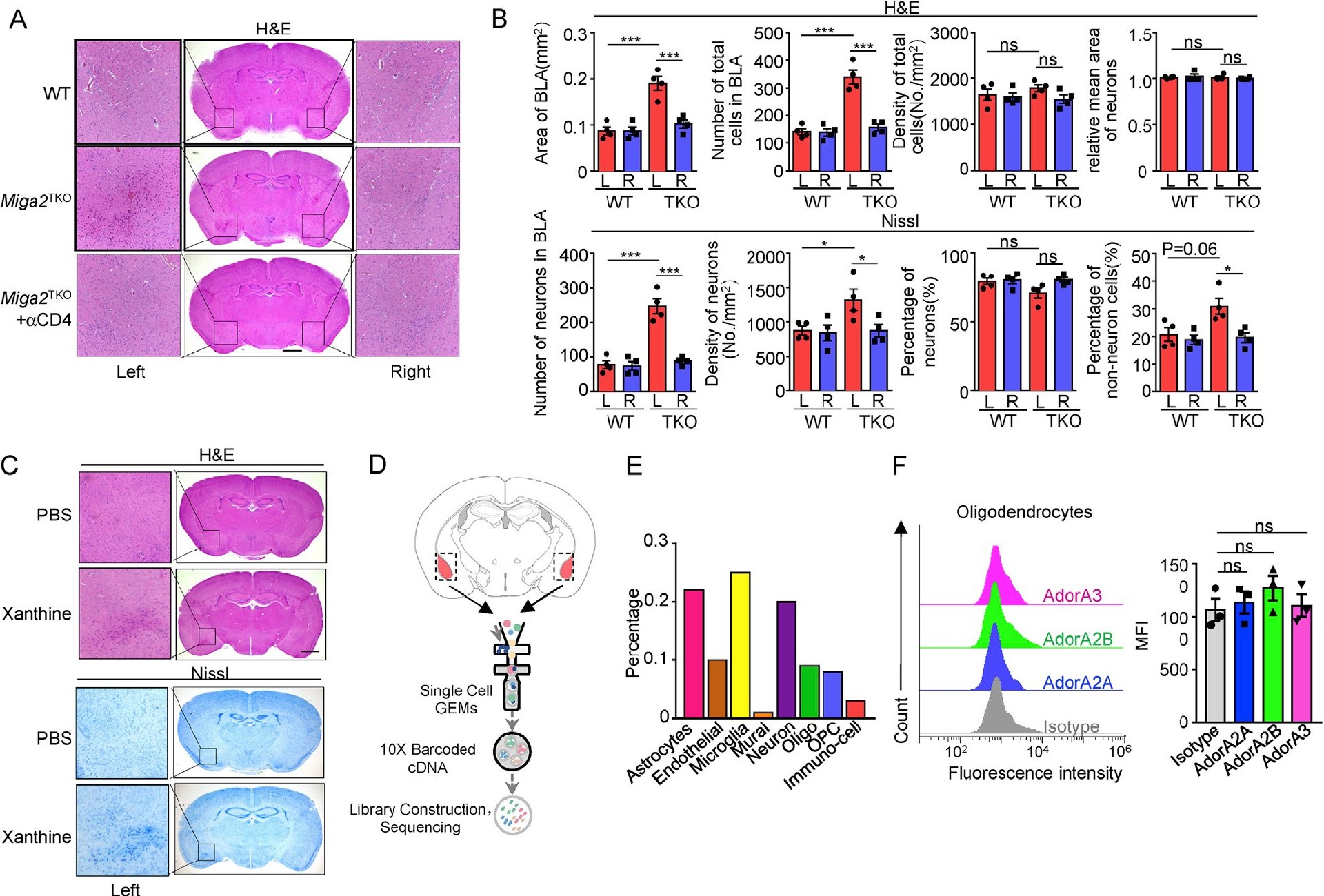 Miga2或黄嘌呤的敲除直接作用于左侧杏仁核区域的少突胶质细胞从而引起病理症状。