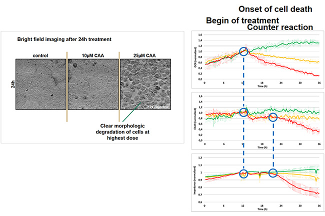 2、毒理药理学研究中,将细胞能量代谢实时检测与活细胞成像结合,诠释了细胞理化性质与细胞密度、细胞活力之间的耦联作用。
