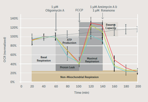 1、经典细胞氧化压力测量模式,测量细胞的基础呼吸、质子漏水平、最大呼吸、呼吸储备能力以及非线粒体耗氧等阶段。